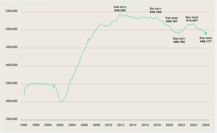 En la medición de enero de 2026, el relevamiento detectó 1.985 empresas menos en un solo mes, mientras que la caída interanual asciende a 13.158 unidades (-2,6%). La contracción afecta a 14 de los 19 sectores económicos, con fuertes retrocesos en transporte y almacenamiento (-15%), actividades inmobiliarias (-11,6%) y construcción (-8,9%).