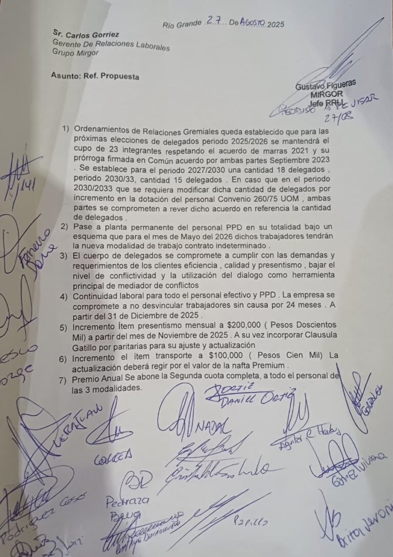 El Cuerpo de Delegados de los Trabajadores de la Unión Obrera Metalúrgica (UOM) en las plantas industriales del Grupo Mirgor presentó una nota formal en la que exige la efectivización del personal encuadrado bajo la modalidad de Prestación Permanente Discontinua (PPD).
