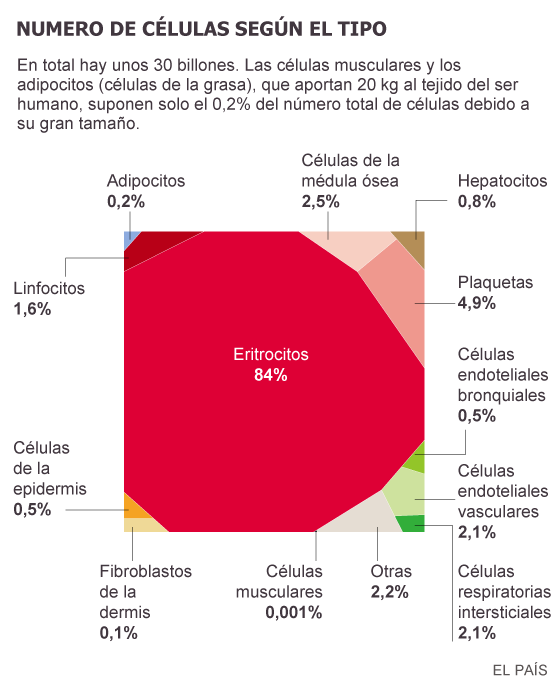De los 70 kilogramos de la persona de referencia no todo corresponde al peso de sus células. El 25% procede del líquido extracelular y otro 7% son sólidos extracelulares. Nuestros 30 billones de células solo pesan 47 kilogramos. El 75% de esta masa se debe a solo dos tipos de células: los adipocitos que forman la grasa y las células musculares. Ambos tipos suponen menos del 0,2% del número total de células de una persona, pero su gran tamaño (10.000 micrómetros cúbicos) hace que representen la mayor parte del peso de un individuo. Los glóbulos rojos, las células más abundantes, tienen un volumen de apenas 100 micrómetros cúbicos y pesan en total dos kilogramos y medio.