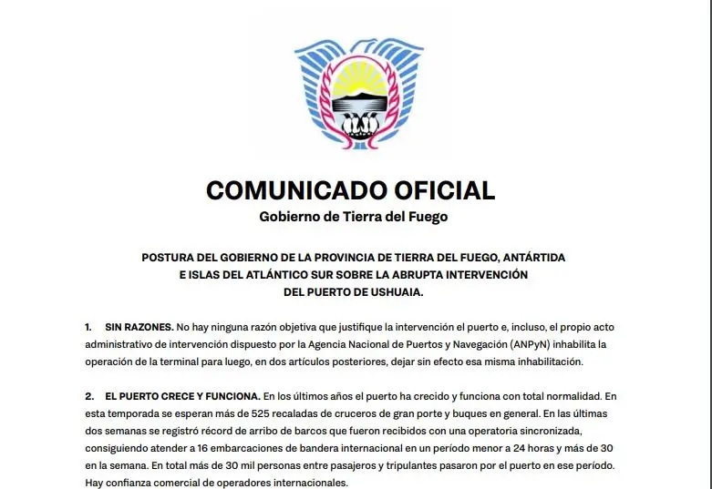 “Se desconocen las razones e intenciones del Gobierno Nacional para avanzar en esta intervención. Se están instalando narrativas preocupantes respecto a intencionalidades geopolíticas o económicas -no explicitadas- que trascienden la realidad del puerto y que parecieran estar detrás de una medida de esta magnitud”, denunciaron, a través de un comunicado, las autoridades de la provincia gobernada por Gustavo Melella.